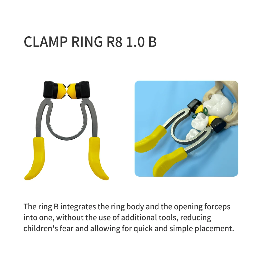 The clamp ring R8 main body is made of super elastic Nickel Titanium alloy, with moderate strength, softness, and deformability, which can well meet the stability and adaptability requirements of the clamping ring for primary and mixed dentition.